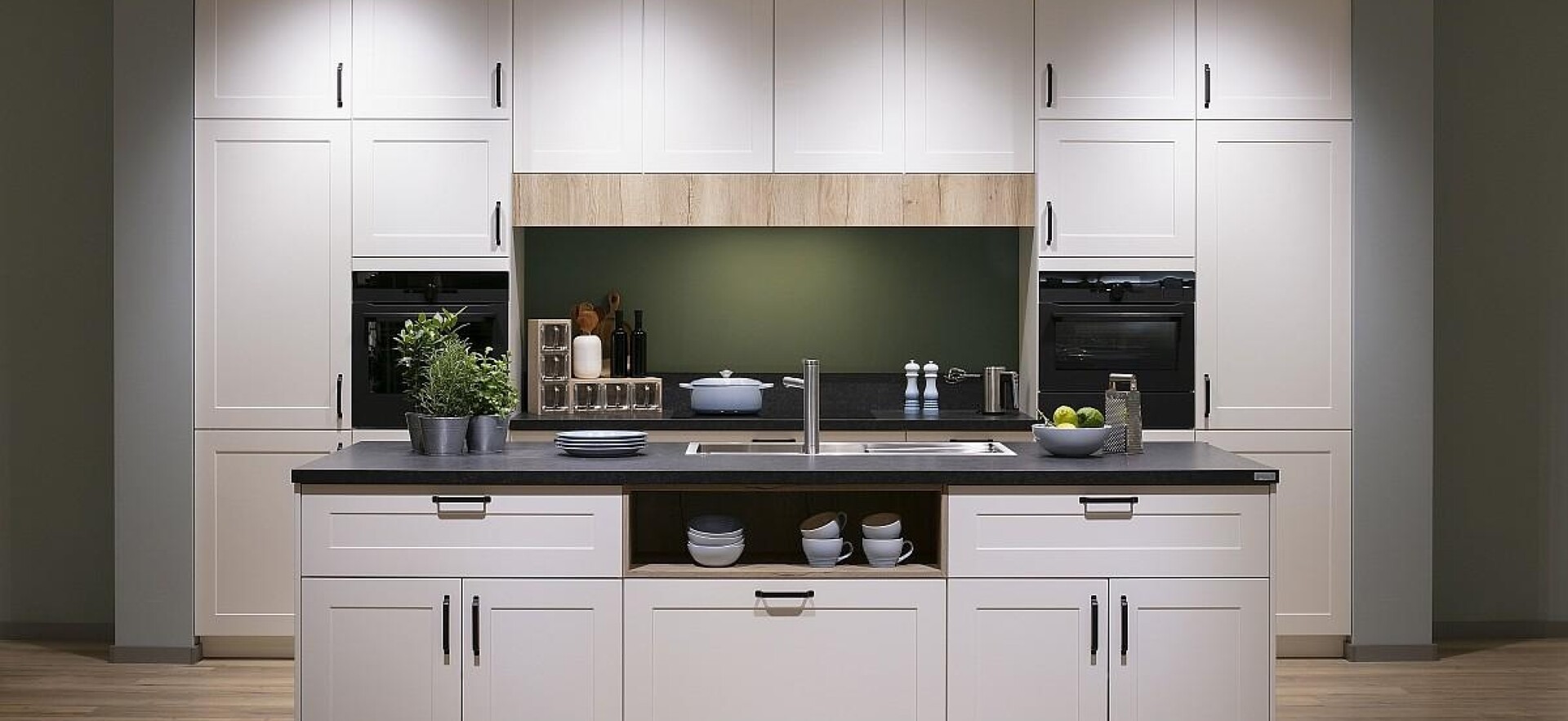 Die Geräteaufteilung folgt dieser harmonischen Komposition gleichfalls wie auch die farbliche Hervorhebung dank weißer Fronten vor den in hellem Taubenblau gestrichenen Wänden. Zum gelungenen Fokus auf diese ausgewogene Geometrie passen natürlich gerade auch Kassettenfronten gut.