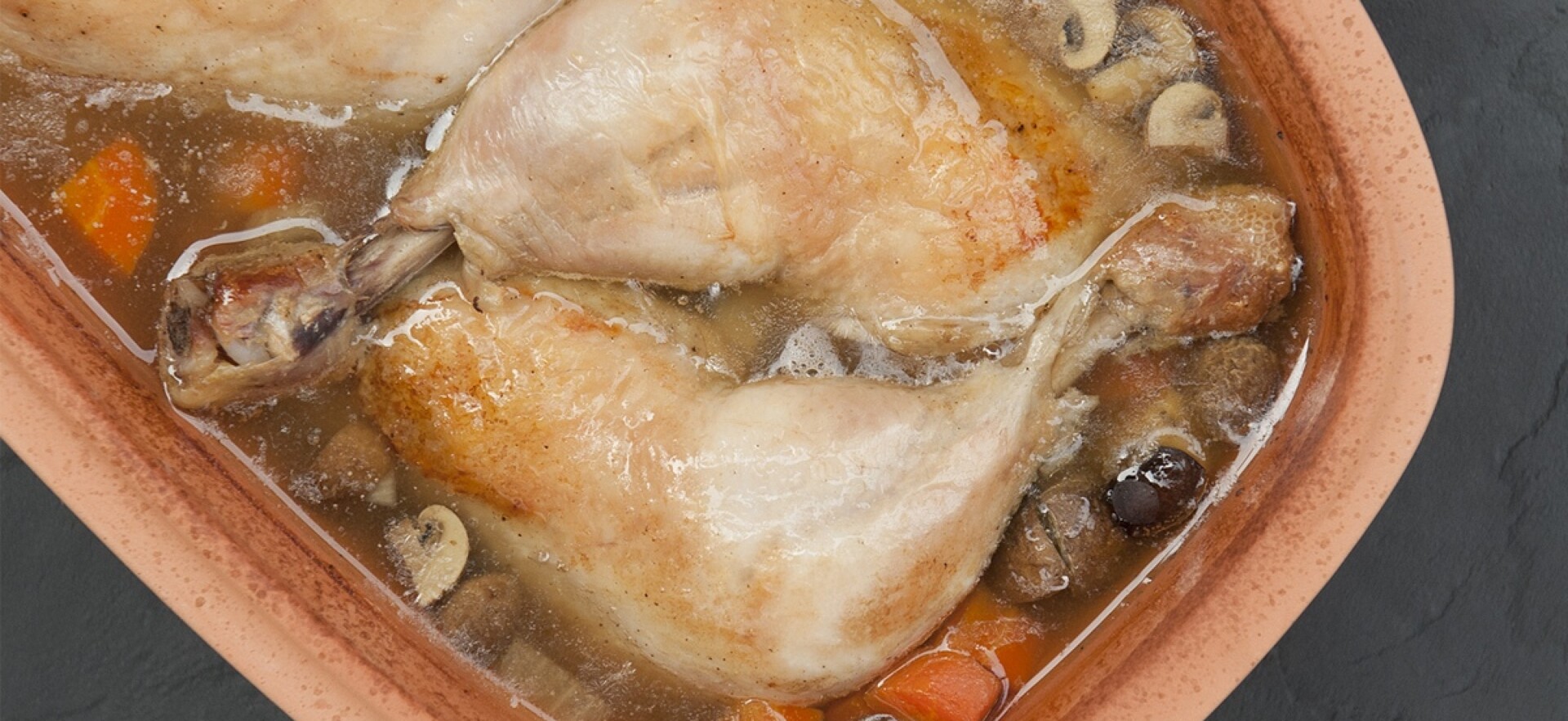 Probieren Sie auch einmal Coq au Vin aus dem Römertopf: Hähnchenkeulen salzen, pfeffern und mit Öl bestreichen. Die restlichen Zutaten wie Zwiebeln, Karotten, Sellerie, Champignons und Knoblauch mit je 1/8 Liter Weißwein und Brühe in den gewässerten Römertopf geben, die Keulen darauf legen. Deckel drauf, in den kalten Backofen stellen und bei 175° Umluft (200° Ober-/Unterhitze) rund 1,5 Stunden garen.