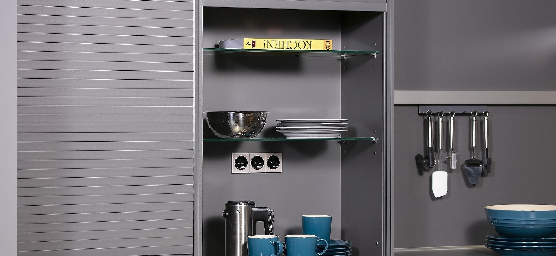Das nebenstehende Küchenbeispiel zeigt, wie praktisch das ist: Vieles, das man täglich benötigt, kann hier schmutzsicher und trotzdem griffbereit verstaut werden. Und die Jalousie arretiert an jeder Stelle, kann also halb, ganz oder nur zu einem Drittel aufgeschoben werden. Ganz ohne dass im geöffneten Zustand Türen im Weg sind :-)