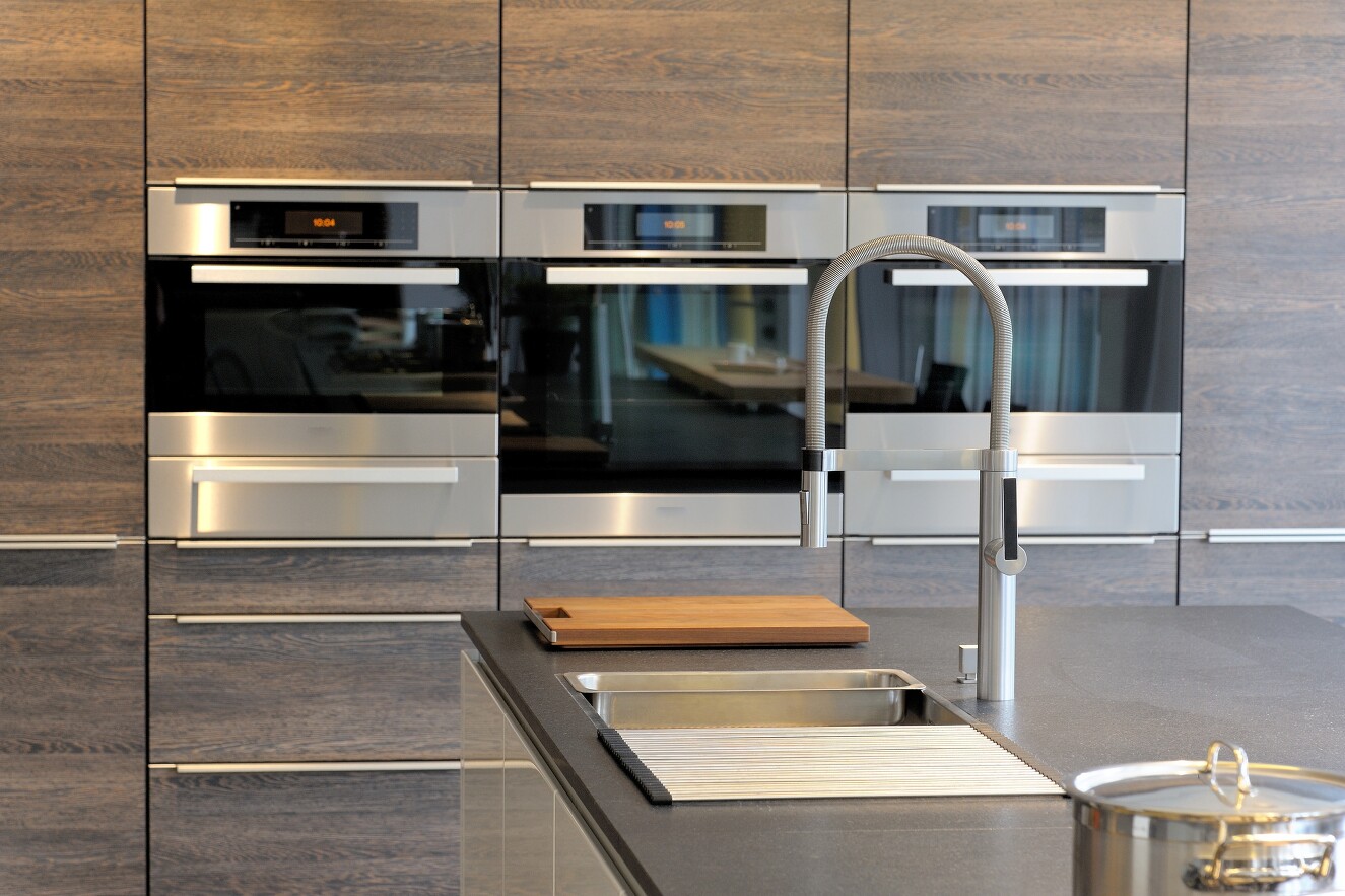 Die Entscheidung hört bei den Fronten nicht auf. Einen wesentlichen Bestandteil der Küchenplanung machen die Einbaugeräte aus. Neben der Überlegung, welche Funktionen persönlich Vorrang haben (Dampfgaren, Grillen, Weinkühlen etc.), müssen auch Farb- und Design-Komposition stimmen und gefallen. Einbaugeräte können dabei tolle Akzente setzen, wenn man sie bewusst auffallen lässt. Denn auch bei den Gerätefronten sind ganz neue Materialien ins Spiel gekommen – von der klassischen Edelstahloberfläche über großzügige Flächen aus schwarzem Glas bis hin zu grifflosen Spiegelglasfronten