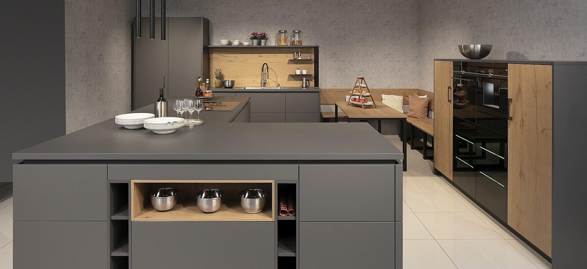So eine L-Insel kann auch ein bisschen kompakter aufgebaut werden. Wenn Sie Feuer gefangen haben, kommen Sie einfach auf uns zu! Das gezeigte Beispiel der mattgrauen L-Kücheninsel zeigt, dass diese sich auch sehr gut für offene Küchen eignet: Die zum Wohnraum hin zeigende L-Seite wird mit Regaleinschüben versehen, in die man hübsche Gefäße stellen kann, was gleich eine wohnliche Atmosphäre verbreitet.