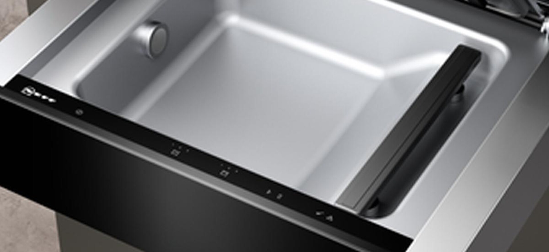 Vakuumiergeräte kennt jeder, aber was soll das als Schublade, und wo ist der Vorteil? Zum einen werden die Schubladen eingebaut, man muss also nicht noch ein weiteres Elektrogerät irgendwo verstauen. Zum anderen entsteht das Vakuum in der gesamten Schublade und das bedeutet, dass man auch Suppen, Soßen oder etwa Mariniertes vakuumieren kann.