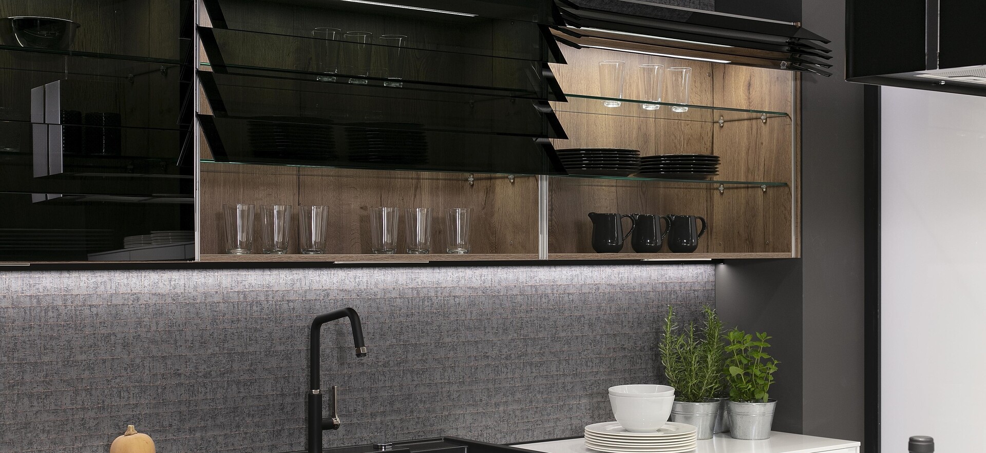 Gepaart mit den darüber angebrachten Glas-Lamellen-Schränken kommt diese elegante Schwarz-Weiß-Gestaltung besonders gut zum Tragen. Wenn es genau solche Küchenideen sind, die Sie sich von Ihrem Küchenstudio wünschen, sind Sie bei uns an der richtigen Adresse!